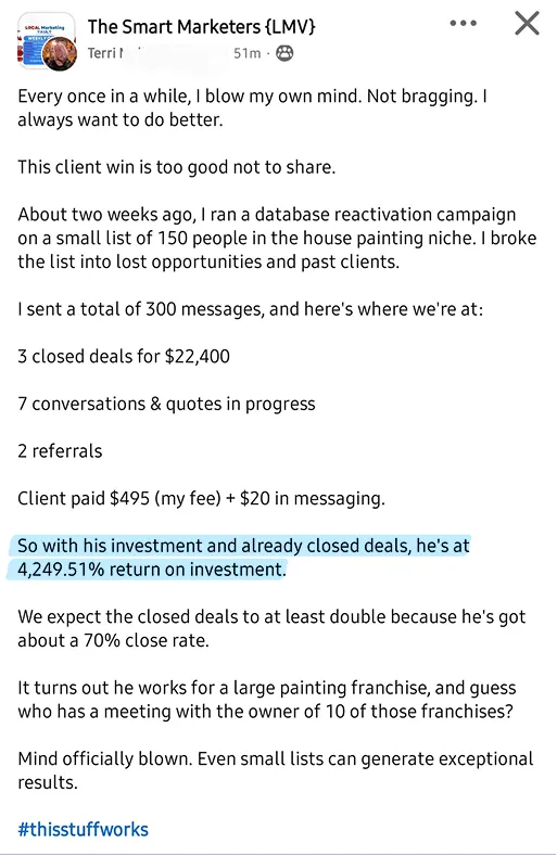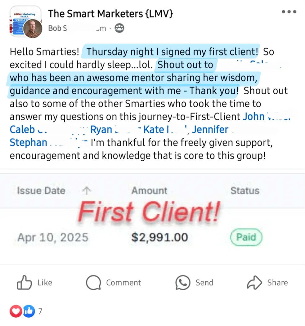 After 25 years in corporate tech sales, David was done with the travel, the grind, and the lack of freedom. He quit his job, joined Local Marketing Vault, and within two months landed a $4,000/month client in the insurance adjusting space.