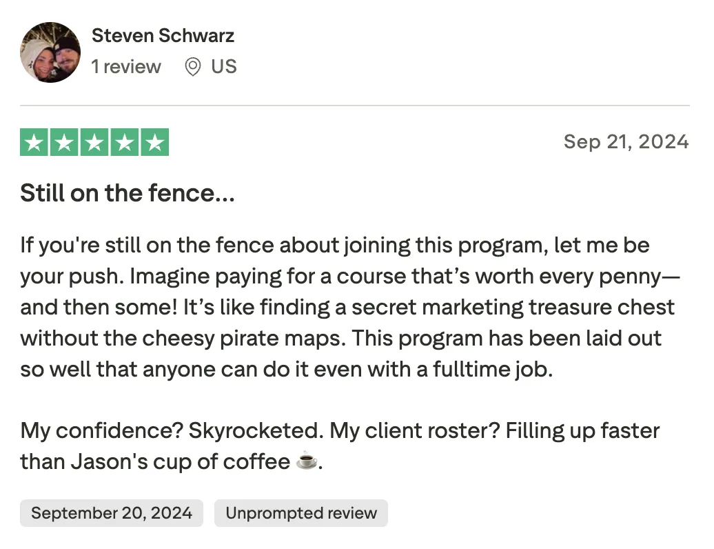 We don’t give you a course and disappear. This is a mentorship, which means support, live guidance, and tools you actually use. The system is proven. The templates are done-for-you. And the calls and community mean you never have to figure it out alone.